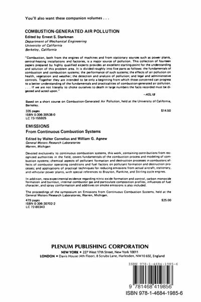 1. Engine Exhaust Emissions.- I. Introduction.- II. When Is an Emittant a Pollutant?.- III. Formation of Pollutants.- IV. Transient Operation - Engines.- V. Transient Operation - System.- VI. Evaluation of Vehicle Emissions.- VII. Control Techniques.- References.- 2. The Chemistry of Spark-Ignition Engine Combustion and Emission Formation.- I. Introduction.- II. Engine Processes.- III. Ultimate Fate of Engine Emissions.- IV. The Engine-A Chemical Reactor.- V. The Combustion Chamber.- VI. Exhaust System.- VII. Systems Approach to Reactions in an Engine.- VIII. Summary.- References.- 3. Mechanism of Hydrocarbon Formation in Combustion Processes.- I. Introduction.- II. Ignition Delays in Low Molecular Weight Hydrocarbon-Oxydizer Systems.- III. Production and Emission of Unburned Hydrocarbons.- IV. Some Effects of Hydrocarbon Emissions on Man and His Environment.- References.- 4. The Kinetics of Pollutant Formation in Spark-Ignition Engines.- I. Introduction.- II. Chemical Thermodynamics of the Engine Cycle.- III. Combustion of Hydrocarbon Fuel-Air Mixtures and the Approach to the Initial High-Temperature Equilibrium State.- IV. Formation of Nitric Oxide.- V. Expansion and Exhaust Processes.- VI. The Effect of Pressure Oscillations on Nitric Oxide Kinetics.- 5. Particulate Emission from Spark-Ignition Engines.- I. Introduction.- II. Measurement Techniques.- III. Physical Characteristics of Particulates.- IV. Chemical Composition of Particulates.- V. Concluding Remarks.- References.- 6. Diesel Engines Combustion and Emissions.- I. Introduction.- II. Diesel Ignition and Combustion.- III. Direct-Injection Engines.- IV. The M-System.- V. Indirect Injection Engines.- VI. Comparison Between the Emission Characteristics of Some Transportation Engines.- VII. NO EmissionControl.- VIII. Concluding Remarks.- References.- 7. Diffusion and Fallout of Pollutants Emitted by Aircraft Engines.- I. Introduction.- II. Identification of Sources.- III. Diffusion and Fallout.- IV. Chemical and Physical Conversions.- V. Plume Axis from a Stack.- VI. Plume Paths from Aircraft.- VII. Wing-Tip Vortices.- VIII. Plume Visibility.- IX. Concluding Remarks.- Notation.- References.- 8. Instrumentation and Techniques for Measuring Emissions.- I. Methods for Measuring Pollutants.- II. Automotive Emissions Measurement.- III. Measurement of Emissions from Diesel and Turbine Engines.- References.- 9. Direct-Sampling Studies of Combustion Processes.- I. Introduction.- II. A Simplified Model of Molecular-Beam Sampling.- III. Boundary-Layer Considerations.- IV. Chemical Relaxations.- V. Species Condensations.- VI. Skimmer Interference.- VII. Mass Separations.- VIII. Background Scattering.- IX. Mass-Spectra Interpretations.- X. Preliminary Applications.- References.
