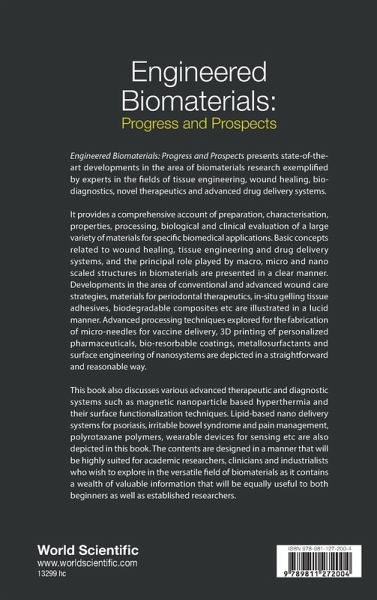 Engineered Biomaterials: Progress and Prospects presents state-of-the-art developments in the area of biomaterials research exemplified by experts in the fields of tissue engineering, wound healing, bio-diagnostics, novel therapeutics and advanced drug delivery systems. It provides a comprehensive account of preparation, characterisation, properties, processing, biological and clinical evaluation of a large variety of materials for specific biomedical applications. Basic concepts related to wound healing, tissue engineering and drug delivery systems, and the principal role played by macro, micro and nano scaled structures in biomaterials are presented in a clear manner. Developments in the area of conventional and advanced wound care strategies, materials for periodontal therapeutics, in-situ gelling tissue adhesives, biodegradable composites etc are illustrated in a lucid manner. Advanced processing techniques explored for the fabrication of micro-needles for vaccine delivery, 3D printing of personalized pharmaceuticals, bio-resorbable coatings, metallosurfactants and surface engineering of nanosystems are depicted in a straightforward and reasonable way. This book also discusses various advanced therapeutic and diagnostic systems such as magnetic nanoparticle based hyperthermia and their surface functionalization techniques. Lipid-based nano delivery systems for psoriasis, irritable bowel syndrome and pain management, polyrotaxane polymers, wearable devices for sensing etc are also depicted in this book. The contents are designed in a manner that will be highly suited for academic researchers, clinicians and industrialists who wish to explore in the versatile field of biomaterials as it contains a wealth of valuable information that will be equally useful to both beginners as well as established researchers.