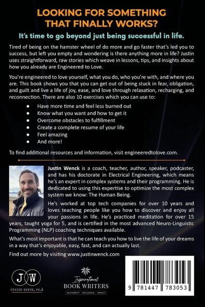 LOOKING FOR SOMETHING THAT FINALLY WORKS? Tired of being on the hamster wheel of do more and go faster that's led you to success, but left you empty and wondering is there anything more in life? Justin uses straightforward, raw stories which weave in lessons, tips, and insights about how you already are Engineered to Love. You're engineered to love yourself, what you do, who you're with, and where you are. This book shows you that you can get out of being stuck in fear, obligation, and guilt and live a life of joy, ease, and love through relaxation, recharging, and reconnection. There are also 10 exercises which you can use to: ¿ Have more time and feel less burned out ¿ Know what you want and how to get it ¿ Overcome obstacles to fulfillment ¿ Create a complete resume of your life ¿ Feel amazing ¿ And more! To find additional resources and information, visit engineeredtolove.com. Justin Wenck is a coach, teacher, author, speaker, podcaster, and has his doctorate in Electrical Engineering, which means he's an expert in complex systems and their programming. He is dedicated to using this expertise to optimize the most complex system we know: The Human Being. He's worked at top tech companies for over 10 years and loves teaching people like you how to discover and enjoy all your passions in life. He's practiced meditation for over 15 years, taught yoga for 5, and is certified in the most advanced Neuro-Linguistic Programming (NLP) coaching techniques available. What's most important is that he can teach you how to live the life of your dreams in a way that's enjoyable, easy, fast, and can actually last. Find out more by visiting www.justinwenck.com