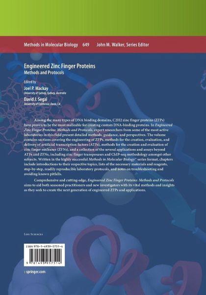 Engineering Zinc Finger Proteins.- The Generation of Zinc Finger Proteins by Modular Assembly.- Engineering Single Cys2His2 Zinc Finger Domains Using a Bacterial Cell-Based Two-Hybrid Selection System.- Bipartite Selection of Zinc Fingers by Phage Display for Any 9-bp DNA Target Site.- Structure-Based DNA-Binding Prediction and Design.- Artificial Transcription Factors.- Generation of Cell-Permeable Artificial Zinc Finger Protein Variants.- Inhibition of Viral Transcription Using Designed Zinc Finger Proteins.- Modulation of Gene Expression Using Zinc Finger-Based Artificial Transcription Factors.- Construction of Combinatorial Libraries that Encode Zinc Finger-Based Transcription Factors.- Silencing of Gene Expression by Targeted DNA Methylation: Concepts and Approaches.- Remodeling Genomes with Artificial Transcription Factors (ATFs).- Transgenic Mice Expressing an Artificial Zinc Finger Regulator Targeting an Endogenous Gene.- Zinc Finger Nucleases.- Artificial Zinc Finger Nucleases for DNA Cloning.- In Vitro Assessment of Zinc Finger Nuclease Activity.- Quantification of Zinc Finger Nuclease-Associated Toxicity.- A Rapid and General Assay for Monitoring Endogenous Gene Modification.- Engineered Zinc Finger Proteins for Manipulation of the Human Mitochondrial Genome.- High-Efficiency Gene Targeting in Drosophila with Zinc Finger Nucleases.- Using Zinc Finger Nucleases for Efficient and Heritable Gene Disruption in Zebrafish.- A Transient Assay for Monitoring Zinc Finger Nuclease Activity at Endogenous Plant Gene Targets.- Validation and Expression of Zinc Finger Nucleases in Plant Cells.- Non-FokI-Based Zinc Finger Nucleases.- Beyond Transcription and Cleavage.- Designing and Testing Chimeric Zinc Finger Transposases.- Seeing Genetic and Epigenetic Information Without DNA Denaturation Using Sequence-Enabled Reassembly (SEER).- Zinc Finger-Mediated Live Cell Imaging in Arabidopsis Roots.- Biophysical Analysis of the Interaction of Toxic Metal Ions and Oxidants with the Zinc Finger Domain of XPA.- Preparation and Zinc-Binding Properties of Multi-Fingered Zinc-Sensing Domains.- Using ChIP-seq Technology to Identify Targets of Zinc Finger Transcription Factors.- Crystallization of Zinc Finger Proteins Bound to DNA.- Beyond DNA: Zinc Finger Domains as RNA-Binding Modules.