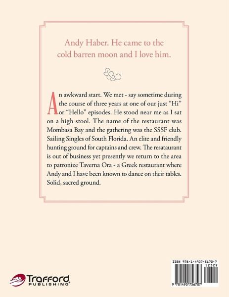 Andy Haber. He came to the cold barren moon and I love him. An awkward start. We met - say sometime during the course of three years at one of our just "Hi" or "Hello" episodes. He stood near me as I sat on a high stool. The name of the restaurant was Mombasa Bay and the gathering was the SSSF club. Sailing Singles of South Florida. An elite and friendly hunting ground for captains and crew. The resataurant is out of business yet presently we return to the area to patronize Taverna Ora - a Greek restaurant where Andy and I have been known to dance on their tables. Solid, sacred ground.