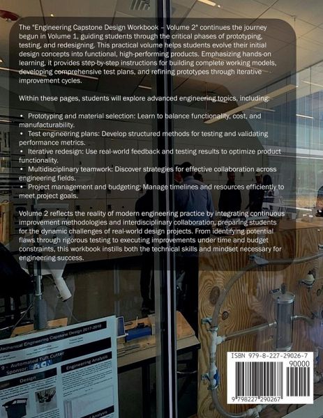 The "Engineering Capstone Design Workbook - Volume 2" continues the journey begun in Volume 1, guiding students through the critical phases of prototyping, testing, and redesigning. This practical volume helps students evolve their initial design concepts into functional, high-performing products. Emphasizing hands-on learning, it provides step-by-step instructions for building complete working models, developing comprehensive test plans, and refining prototypes through iterative improvement cycles. Within these pages, students will explore advanced engineering topics, including:Prototyping and material selection: Learn to balance functionality, cost, and manufacturability. Test engineering plans: Develop structured methods for testing and validating performance metrics. Iterative redesign: Use real-world feedback and testing results to optimize product functionality. Multidisciplinary teamwork: Discover strategies for effective collaboration across engineering fields. Project management and budgeting: Manage timelines and resources efficiently to meet project goals. Volume 2 reflects the reality of modern engineering practice by integrating continuous improvement methodologies and interdisciplinary collaboration, preparing students for the dynamic challenges of real-world design projects. From identifying potential flaws through rigorous testing to executing improvements under time and budget constraints, this workbook instills both the technical skills and mindset necessary for engineering success.