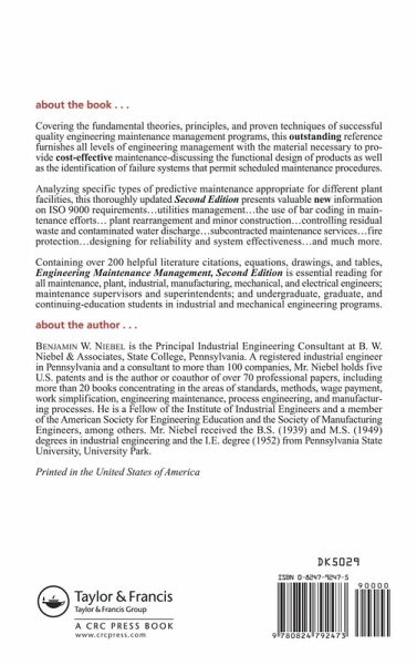 This work sets out to furnish all levels of engineering management with the material necessary to provide cost-effective maintenance, discussing the functional design of products as well as the identification of failure systems that permit scheduled maintenance procedures. This second edition presents information on ISO 9000 requirements, utilities management, the use of bar-coding in maintenance efforts, plant re-arrangement and minor construction, and more.