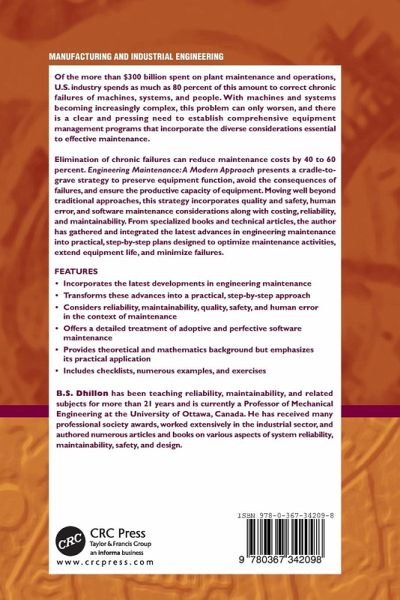 B.S. Dhillon has been teaching reliability, maintainability, and related subjects for more than 21 years and is currently a Professor of Mechanical Engineering at the University of Ottawa, Canada. He has received many professional society awards, worked extensively in the industrial sector, and authored numerous articles and books on various aspects of system reliability, maintainability, safety, and design.