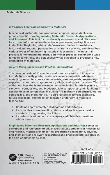 Introduces Emerging Engineering Materials Mechanical, materials, and production engineering students can greatly benefit from Engineering Materials: Research, Applications and Advances. This text focuses heavily on research, and fills a need for current information on the science, processes, and applications in the field. Beginning with a brief overview, the book provides a historical and modern perspective on material science, and describes various types of engineering materials. It examines the industrial process for emerging materials, determines practical use under a wide range of conditions, and establishes what is needed to produce a new generation of materials. Covers Basic Concepts and Practical Applications The book consists of 18 chapters and covers a variety of topics that include functionally graded materials, auxetic materials, whiskers, metallic glasses, biocomposite materials, nanomaterials, superalloys, superhard materials, shape-memory alloys, and smart materials. The author outlines the latest advancements, including futuristic plastics, sandwich composites, and biodegradable composites, and highlights special kinds of composites, including fire-resistant composites, marine composites, and biomimetics. He also factors in current examples, future prospects, and the latest research underway in materials technology. Contains approximately 160 diagrams and 85 tables Incorporates examples, illustrations, and applications used in a variety of engineering disciplines Includes solved numerical examples and objective questions with answers Engineering Materials: Research, Applications and Advances serves as a textbook and reference for advanced/graduate students in mechanical engineering, materials engineering, production engineering, physics, and chemistry, and relevant researchers and practicing professionals in the field of materials science.
