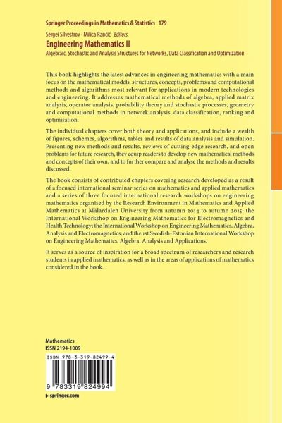 This book highlights the latest advances in engineering mathematics with a main focus on the mathematical models, structures, concepts, problems and computational methods and algorithms most relevant for applications in modern technologies and engineering. It addresses mathematical methods of algebra, applied matrix analysis, operator analysis, probability theory and stochastic processes, geometry and computational methods in network analysis, data classification, ranking and optimisation.