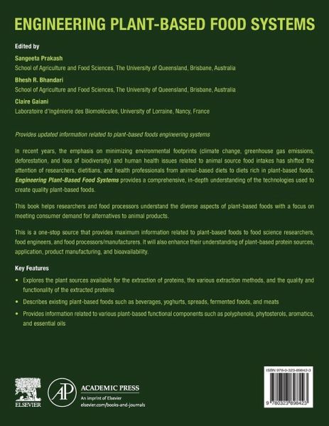 Engineering Plant-Based Food Systems provides a comprehensive, in-depth understanding on the technologies used to create quality plant-based foods. This title helps researchers and food processors gain an understanding of the diverse aspects of plant-based foods, with a focus to meet the current consumers' demand of alternatives to animal products. This is a one-stop source that provides maximum information related to plant-based foods to food science researchers, food engineers and food processing/manufacturers. This book will enhance their understanding of plant-based protein sources, their application, product manufacturing, and bioavailability. In recent years, the emphasis on minimizing environmental footprints (climate change, greenhouse gas emissions, deforestation, and loss of biodiversity) and human health issues related to animal source food intakes has shifted the attention of researchers, dietitians and health professionals from animal-based diets to diets rich in plant-based foods (legumes, nuts, seeds).