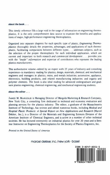 This book provides solutions to many vital questions on the important property differences and advantages of individual engineering thermoplastics. It is useful for executives; managers; design, materials, and sales engineers; researchers; materials and product manufacturers; and compounders.