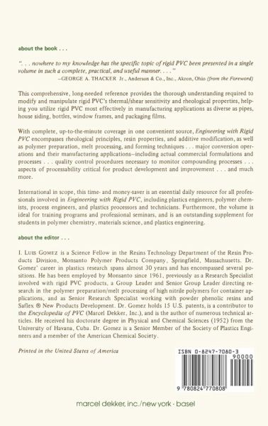 This comprehensive, long-needed reference provides the thorough understanding required tomodify and manipulate rigid PVC's thermal/shear sensitivity and rheological properties, helpingyou utilize rigid PVC most effectively in manufacturing applications as diverse as pipes,house siding, bottles , window frames, and packaging films.With complete, up-to-the-minute coverage in one convenient source, Engineering with RigidPVC encompasses rheological principles, resin properties, and additive modification, as wellas polymer preparation, melt processing, and forming techniques ... major conversion operationsand their manufacturing applications-including actual commercial formulations andprocesses .. . quality control procedures necessary to monitor compounding processes ...aspects of processability critical for product development and improvement .. . and muchmore.International in scope, this time- and money-saver is an eseential daily resource for all professionalsinvolved in Engineering with Rigid PVC, including plastics engineers, polymer chemists,process engineers, and plastics processors and technicians. Furthermore, the volume isideal for training programs and professional seminars, and is an outstanding supplement forstudents in polymer chemistry , materials science , and plastics engineering.