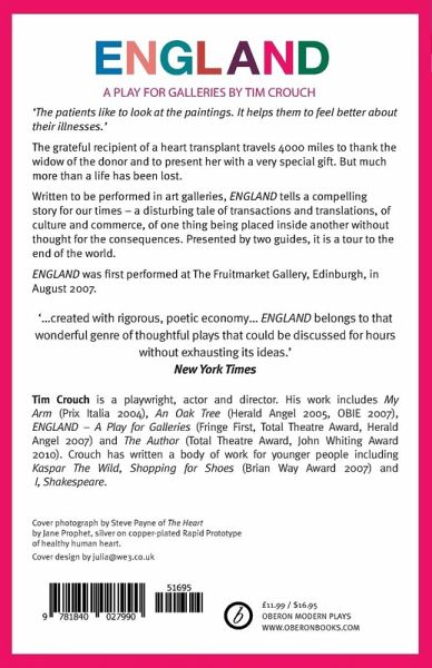 "The patients like to look at the paintings. It helps them to feel better about their illnesses." The grateful recipient of a heart transplant travels 4000 miles to thank the widow of the donor and to present her with a very special gift. But much more than a life has been lost. Written and performed in art galleries, England tells a compelling story for our times - a disturbing tale of transactions and translations, of culture and commerce, of one thing being placed inside another without thought for the consequences. Presented by two guides, it is a tour to the end of the world. England was first performed at the Fruitmarket Gallery, Edinburgh, in August 2007.