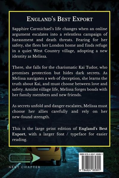 Sapphire Carmichael's life changes when an online argument escalates into a relentless campaign of harassment and death threats. Fearing for her safety, she flees her London home and finds refuge in a quiet West Country village, adopting a new identity as Melissa. There, she falls for the charismatic Kai Tudor, who promises protection but hides dark secrets. As Melissa navigates a web of deception, she learns the truth about Kai, and must choose between love and safety. Amidst village life, Melissa forges bonds with her family members and new friends. As secrets unfold and danger escalates, Melissa must choose her allies carefully and rely on her new-found strength. This is the large print edition of England's Best Export, with a larger font / typeface for easier reading.
