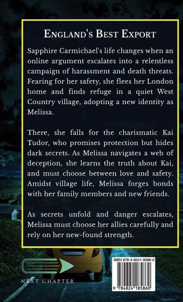 Sapphire Carmichael's life changes when an online argument escalates into a relentless campaign of harassment and death threats. Fearing for her safety, she flees her London home and finds refuge in a quiet West Country village, adopting a new identity as Melissa. There, she falls for the charismatic Kai Tudor, who promises protection but hides dark secrets. As Melissa navigates a web of deception, she learns the truth about Kai, and must choose between love and safety. Amidst village life, Melissa forges bonds with her family members and new friends. As secrets unfold and danger escalates, Melissa must choose her allies carefully and rely on her new-found strength.