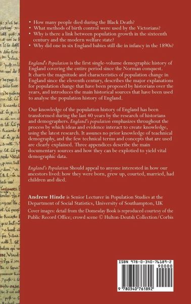 The first single-volume demographic history of England covering the entire period since the Norman conquest. It charts the magnitude and characteristics of population change in England since the eleventh century, describes the major explanations for population change which have been proposed by historians over the years, and introduces the main historical sources which have been used to analyze the population history of England.