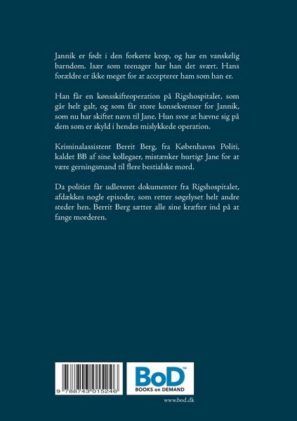 Jannik er født i den forkerte krop, og har en vanskelig barndom. Især som teenager har han det svært. Hans forældre er ikke meget for at accepterer ham som han er. Han får en kønsskifteoperation på Rigshospitalet, som går helt galt, og som får store konsekvenser for Jannik, som nu har skiftet navn til Jane. Hun svor at hævne sig på dem som er skyld i hendes mislykkede operation. Kriminalassistent Berrit Berg, fra Københavns Politi, kaldet BB af sine kollegaer, mistænker hurtigt Jane for at være gerningsmand til flere bestialske mord. Da politiet får udleveret dokumenter fra Rigshospitalet, afdækkes nogle episoder, som retter søgelyset helt andre steder hen. Berrit Berg sætter alle sine kræfter ind på at fange morderen.