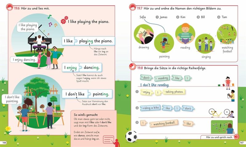 - Klares modulares Konzept: Jedes Kapitel folgt einer klaren Struktur aus einer großen Illustration mit den wichtigsten Vokabeln, einer Einführung von 2-3 Grammatik-/Sprachthemen und zahlreichen Übungsaufgaben unter Verwendung des neu gelernten Stoffes.