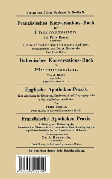 I. Häusig vorkommemde Ausdrücke im täglichen pharmazeutischen Leben.- II. Allgemeine Arzneimittel und dahin gehürende Ausdrücke.- III. Chirurgische und ähnliche Rebenverkaufsartikel der Apotheker.- IV. Der menschliche Kürper und seine Teile.- V. Die Krankheiten des menschlichen Körpers.- VI. Die englische Nomenklatur.- VII. Drogen, Chemikalien, pharmazemtische Präparate.- VIII. Das englische Rezept.- 1. Rezeptbeispiele aus der emglischem Rezeptur.- 2. Die englische Signatur.- IX. Emglische Gewichte, Hohl- und Längenmaße und ihre Beziehung zu den deutschen.- X. Münzsorten.- XI. Gespräche.
