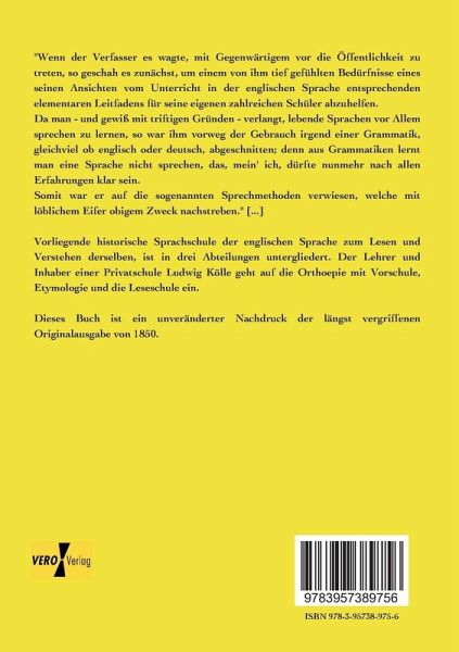 Vorliegende historische Sprachschule der englischen Sprache zum Lesen und Verstehen derselben, ist in drei Abteilungen untergliedert. Der Lehrer und Inhaber einer Privatschule Ludwig Kölle geht auf die Orthoepie mit Vorschule, Etymologie und die Leseschule ein.