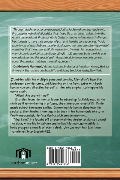 ENGLISH 422 reveals the power of the impact we can have upon one another. The students of Professor Abbie Cutter''s English 422 class are not thinking of that impact as they interact and react, sharing their inner thoughts and lives through their writings . The resulting effect of their time together is intense; eventually leading to the death of one student, the success of another, and the discovery of a new life for a third. Professor Cutter appears to be more a facilitator than a professor, as she uses herself to create an interactive environment among her young, graduating students. The reader will observe that in addition to the English education of one group of college students, this unique novel presents an abbreviation of life itself . The student''s experiences are stories within the story; and the dramatic, life-changing events that evolve, will keep you riveted! One cannot escape identifying with one or more of the characters, nor can one escape seeing the need of becoming more keenly aware of the profound influence we can have on others. "A must read for anyone who is curious about the passion that fuels the writing process." - Dr. K. Marinucci - Assistant Visiting Professor, Hofstra University. Former Professor at NYU and State University, New York.