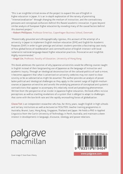 Introduction.- Chapter 1: Workplace narrative.- Chapter 2: Social and political challenges.- Chapter 3: Power and Ideology.- Chapter 4: Academic Knowledge and Meaning Making.- Chapter 5: Positioning EMI in Japan in the context of critical applied linguistics.- Chapter 6: Narrow and Particularised Understandings of English.- Chapter 7: EMI and EAP at crisis point.- Chapter 8: Reasons for the failure of EMI and EAP.