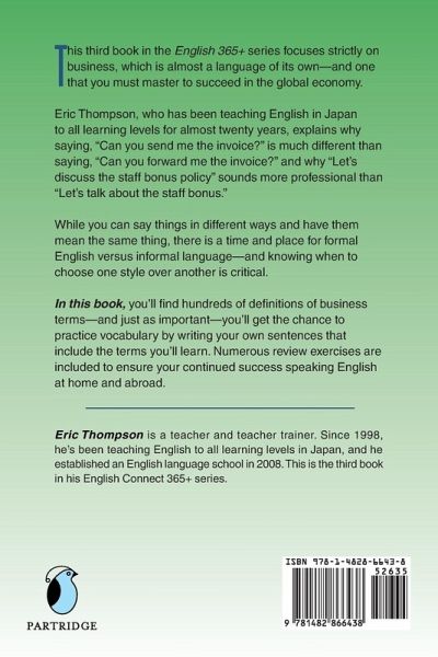 This third book in the English 365+ series focuses strictly on business, which is almost a language of its own-and one that you must master to succeed in the global economy. Eric Thompson, who has been teaching English in Japan to all learning levels for almost twenty years, explains why saying, "Can you send me the invoice?" is much different than saying, "Can you forward me the invoice?" and why "Let's discuss the staff bonus policy" sounds more professional than "Let's talk about the staff bonus." While you can say things in different ways and have them mean the same thing, there is a time and place for formal English versus informal language-and knowing when to choose one style over another is critical. In this book, you'll find hundreds of definitions of business terms-and just as important-you'll get the chance to practice vocabulary by writing your own sentences that include the terms you'll learn. Numerous review exercises are included to ensure your continued success speaking English at home and abroad.