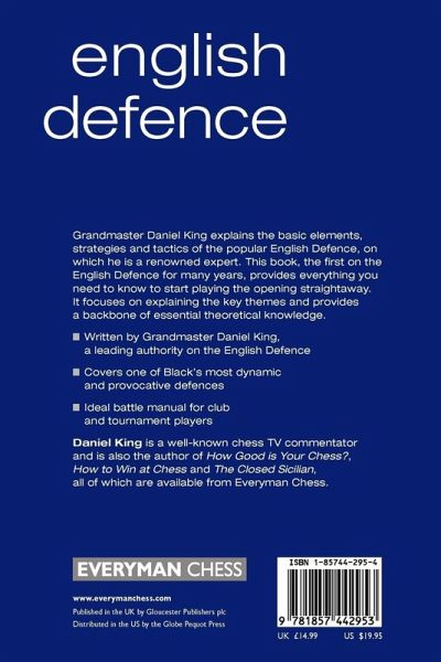 Grandmaster Daniel King explains the basic elements, strategies and tactics of the popular English Defence, at which he is a renowned expert. This is the first book on the English Defence for many years. It provides everything you need to know to start playing the English Defence straight away, focusing on the key themes and providing a backbone of theoretical knowledge.