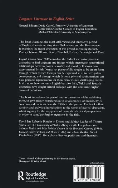 English Drama Since 1940 considers the developments of themes, styles, concerns and contexts, both for individual dramatists and stage drama generally during the period 1940 - 2000. David Rabey introduces us to the theatre and what it does by demonstrating the unique power of the articulate physical presence. He also identifies some of the principal ways that the issue of cultural value is manifested and dramatised in arguments for the presentation and subsidy of theatre in this period. The Longman Literature in English Series is intended to provide students of literature with a critical introduction to the major literary genres in their historical context.