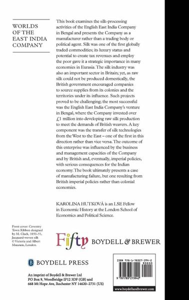 This book examines the silk-processing activities of the English East India Company in Bengal and presents the Company as a manufacturer rather than a trading body or political agent. Silk was one of the first globally traded commodities; its luxury status and potential to create tax revenues and employ the poor gave it a strategic importance in many economies in Eurasia. The silk industry was also an important sector in Britain; yet, as raw silk could not be produced domestically, the British government encouraged companies to source supplies from its colonies and the territories under its influence. Such projects proved to be challenging; the most successful was the English East India Company's venture in Bengal, where the Company invested over 1 million into developing raw silk production to meet the demands of British weavers. A key component was the transfer of silk technologies from the West to the East - one of the first in this direction rather than vice versa. The outcome of this enterprise was influenced by the business and management capacities of the Company and by British and, eventually, imperial policies, with serious consequences for the Indian economy. The book ultimately presents a case of manufacturing failure, but one resulting from British imperial policies rather than colonial economies. KAROLINA HUTKOVÁ is an LSE Fellow in Economic History at the London School of Economics and Political Science.