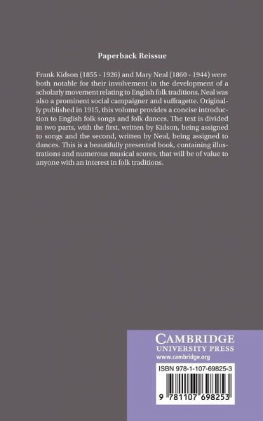 Frank Kidson (1855-1926) and Mary Neal (1860-1944) were both notable for their involvement in the development of a scholarly movement relating to English folk traditions, Neal was also a prominent social campaigner and suffragette. Originally published in 1915, this volume provides a concise introduction to English folk songs and folk dances. The text is divided in two parts, with the first, written by Kidson, being assigned to songs and the second, written by Neal, being assigned to dances. This is a beautifully presented book, containing illustrations and numerous musical scores, that will be of value to anyone with an interest in folk traditions.