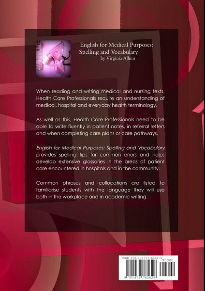When reading and writing medical and nursing texts, Health Care Professionals require an understanding of medical, hospital and everyday health terminology. As well as this, Health Care Professionals need to be able to write fluently in patient notes, in referral letters and when completing care plans or care pathways. English for Medical Purposes: Spelling and Vocabulary provides spelling tips for common errors and helps develop extensive glossaries in the areas of patient care encountered in hospitals and also in the community. Common phrases and collocations are listed to familiarise students with the language they will use both in the workplace and in academic writing.