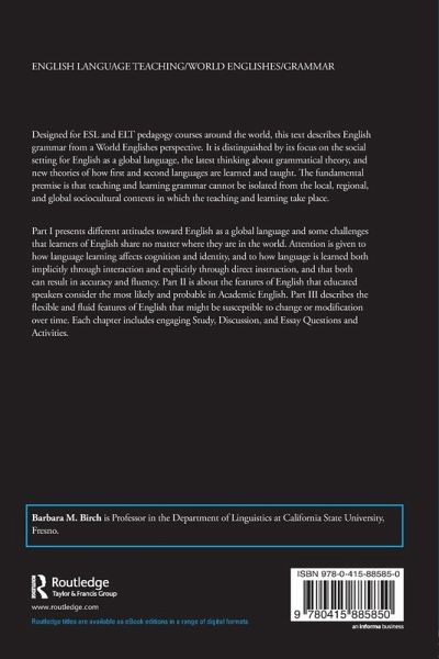 Designed for ESL and ELT pedagogy courses around the world, this text describes English grammar from a World Englishes perspective. It is distinguished by its focus on the social setting for English as a global language, the latest thinking about grammatical theory, and new theories of how first and second languages are learned and taught. The fundamental premise is that teaching and learning grammar cannot be isolated from the local, regional, and global sociocultural contexts in which the teaching and learning take place. Part I presents different attitudes toward English as a global language and some challenges that learners of English share no matter where they are in the world. Part II is about the features of English that educated speakers consider the most likely and probable in Academic English. Part III describes the flexible and fluid features of English that might be susceptible to change or modification over time. Each chapter includes engaging Study, Discussion, and Essay Questions and Activities.