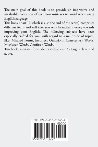 The main goal of this book is to provide an impressive and invaluable collection of common mistakes to avoid when using English language. This book (part II, which is also the end of the series) comprises different items and will take you on a beautiful journey towards improving your English. The following subjects have been especially crafted for you, with regard to a multitude of topics, like: Misused Forms, Incorrect Omissions, Unnecessary Words, Misplaced Words, Confused Words. This book is suitable for students with at least A2 English level and above.