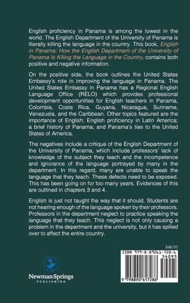 English proficiency in Panama is among the lowest in the world. The English Department of the University of Panama is literally killing the language in the country. This book, English in Panama: How the English Department of the University of Panama Is Killing the Language in the Country, contains both positive and negative information. On the positive side, the book outlines the United States Embassy's role in improving the language in Panama. The United States Embassy in Panama has a Regional English Language Office (RELO) which provides professional development opportunities for English teachers in Panama, Colombia, Costa Rica, Guyana, Nicaragua, Suriname, Venezuela, and the Caribbean. Other topics featured are the importance of English; English proficiency in Latin America; a brief history of Panama; and Panama's ties to the United States of America. The negatives include a critique of the English Department of the University of Panama, which include professors' lack of knowledge of the subject they teach and the incompetence and ignorance of the language portrayed by many in the department. In this regard, many are unable to speak the language that they teach. These defects need to be exposed. This has been going on for too many years. Evidences of this are outlined in chapters 3 and 4. English is just not taught the way that it should. Students are not hearing enough of the language spoken by their professors. Professors in the department neglect to practice speaking the language that they teach. This neglect is not only causing a problem in the department and the university, but it has spilled over to affect the entire country.