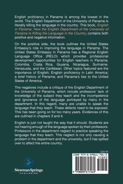 English proficiency in Panama is among the lowest in the world. The English Department of the University of Panama is literally killing the language in the country. This book, English in Panama: How the English Department of the University of Panama Is Killing the Language in the Country, contains both positive and negative information. On the positive side, the book outlines the United States Embassy's role in improving the language in Panama. The United States Embassy in Panama has a Regional English Language Office (RELO) which provides professional development opportunities for English teachers in Panama, Colombia, Costa Rica, Guyana, Nicaragua, Suriname, Venezuela, and the Caribbean. Other topics featured are the importance of English; English proficiency in Latin America; a brief history of Panama; and Panama's ties to the United States of America. The negatives include a critique of the English Department of the University of Panama, which include professors' lack of knowledge of the subject they teach and the incompetence and ignorance of the language portrayed by many in the department. In this regard, many are unable to speak the language that they teach. These defects need to be exposed. This has been going on for too many years. Evidences of this are outlined in chapters 3 and 4. English is just not taught the way that it should. Students are not hearing enough of the language spoken by their professors. Professors in the department neglect to practice speaking the language that they teach. This neglect is not only causing a problem in the department and the university, but it has spilled over to affect the entire country.