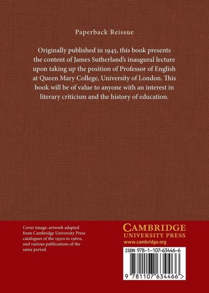 Originally published in 1945, this book presents the content of James Sutherland's inaugural lecture upon taking up the position of Professor of English at Queen Mary College, University of London. This book will be of value to anyone with an interest in literary criticism and the history of education.