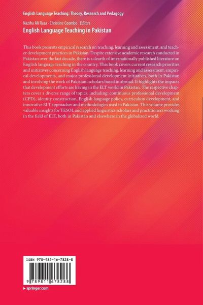 This book presents empirical research on teaching, learning and assessment, and teacher development practices in Pakistan. Despite extensive academic research conducted in Pakistan over the last decade, there is a dearth of internationally published literature on English language teaching in the country. This book covers current research priorities and initiatives concerning English language teaching, learning and assessment, empirical developments, and major professional development initiatives, both in Pakistan and involving the work of Pakistani scholars based in abroad. It highlights the impacts that development efforts are having in the ELT world in Pakistan. The respective chapters cover a diverse range of topics, including: continuous professional development (CPD), identity construction, English language policy, curriculum development, and innovative ELT approaches and methodologies used in Pakistan. This volume provides valuable insights for TESOL and applied linguisticsscholars and practitioners working in the field of ELT, both in Pakistan and elsewhere in the globalized world.