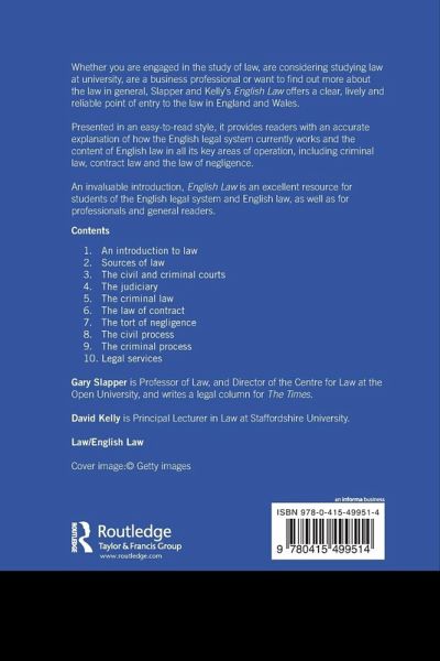 Whether you are engaged in the study of law, are considering studying law at university, are a business professional or want to find out more about the law in general, Slapper and Kelly's English Law offers a clear, lively and reliable point of entry to the law in England and Wales.