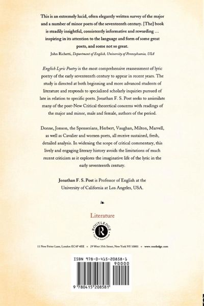 English Lyric Poetry is a comprehensive reassessment of lyric poetry of the early seventeenth century. The study is directed at both beginning and more advanced students of literature, and responds to more specialised scholarly inquiries pursued of late in relation to specific poets. This extremely lucid and elegantly written book avoids the limitations of much recent criticism. Donne, Jonson, the Spenserians, Herbert, Milton, Marvell, Vaughan, as well as many non-canonical and women poets, all receive sustained, fresh, and detailed analysis. Jonathan Post seeks to assimilate many of the post-New Critical theoretical concerns with readings of the major and minor, male and female, authors of the period.