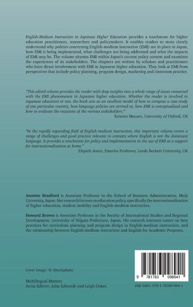 Annette Bradford is Associate Professor in the School of Business Administration, Meiji University, Japan. Her research focuses on education policy, specifically the internationalization of higher education, student mobility and English-medium instruction. Howard Brown is Associate Professor in the Faculty of International Studies and Regional Development, University of Niigata Prefecture, Japan. His research interests center on best practices for curriculum planning and program design in English-medium instruction, and the relationship between English-medium instruction and English for Academic Purposes.