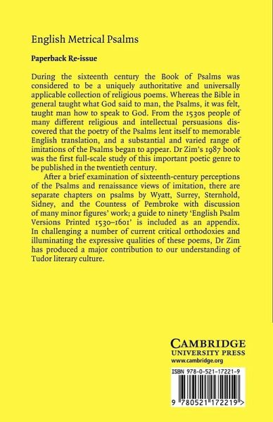 During the sixteenth century the Book of Psalms was considered to be a uniquely authoritative and universally applicable collection of religious poems. Whereas the Bible in general taught what God said to man, the Psalms, it was felt, taught man how to speak to God. From the 1530s people of many different religious and intellectual persuasions discovered that the poetry of the Psalms lent itself to memorable English translation, and a substantial and varied range of imitations of the Psalms began to appear. Dr Zim's 1987 book was the first full-scale study of this important genre to be published in the twentieth century. In challenging a number of critical orthodoxies and illuminating the expressive qualities of these poems, Dr Zim has produced a major contribution to our understanding of Tudor literary culture.