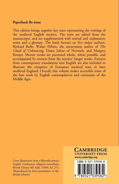 This edition brings together for the first time key texts representing the writings of the medieval English mystics. The texts have been newly edited from early manuscripts, and are supplemented with textual and explanatory notes and a glossary. The book focuses on five major authors, Richard Rolle, Walter Hilton, the anonymous author of The Cloud of Unknowing, Dame Julian of Norwich, and Margery Kempe. Shorter works are presented whole, where possible, and accompanied by extracts from the mystics' longer works; extracts from contemporary translations into English are also included to illustrate the reception of European mystical texts in later medieval England. Overall, this volume makes accessible some of the finest writing by English contemplatives and visionaries of the Middle Ages.