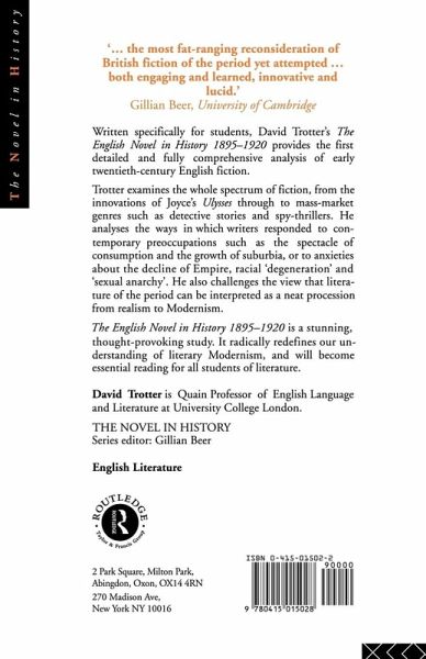 Written especially for students and assuming no prior knowledge of the subject, David Trotter's "The English Novel in History 1895-1920" provides a comprehensive introduction to early 20th-century fiction This study embraces the whole range of early 20th-century fiction, from avant-garde innovations to popular mass-market genres. Separate sections are devoted to James, Conrad, Kipling, Bennett, Lawrence, Lewis, and Joyce. It establishes a classification of literary styles in the period. Based on this classification, it offers an account of the subject-matters which preoccupied writers of all kinds: gender, race, nationality, sexual psychology, production and consumption. "The English Novel in History" aims to redefine our understanding of literary Modernism, and should be useful reading for all students of modern English literature.