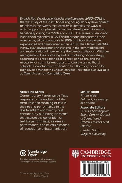 This Element is the first study of the institutionalising of English play development practices in the twenty-first century. It identifies how support for playwrights and text increased during the 1990s and 2000s, and draws attention to a liberatory horizon for play development. This title is also available as Open Access on Cambridge Core.