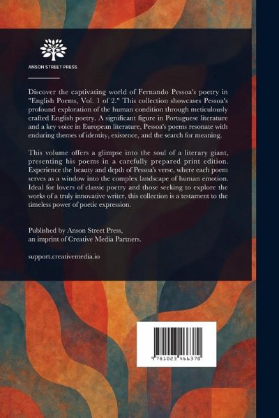 Discover the captivating world of Fernando Pessoa's poetry in "English Poems, Vol. 1 of 2." This collection showcases Pessoa's profound exploration of the human condition through meticulously crafted English poetry. A significant figure in Portuguese literature and a key voice in European literature, Pessoa's poems resonate with enduring themes of identity, existence, and the search for meaning. This volume offers a glimpse into the soul of a literary giant, presenting his poems in a carefully prepared print edition. Experience the beauty and depth of Pessoa's verse, where each poem serves as a window into the complex landscape of human emotion. Ideal for lovers of classic poetry and those seeking to explore the works of a truly innovative writer, this collection is a testament to the timeless power of poetic expression. This work has been selected by scholars as being culturally important, and is part of the knowledge base of civilization as we know it. This work is in the public domain in the United States of America, and possibly other nations. Within the United States, you may freely copy and distribute this work, as no entity (individual or corporate) has a copyright on the body of the work. Scholars believe, and we concur, that this work is important enough to be preserved, reproduced, and made generally available to the public. We appreciate your support of the preservation process, and thank you for being an important part of keeping this knowledge alive and relevant.