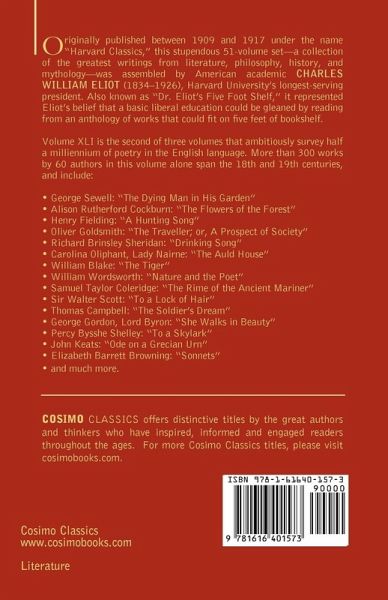 Originally published between 1909 and 1917 under the name "Harvard Classics," this stupendous 51-volume set-a collection of the greatest writings from literature, philosophy, history, and mythology-was assembled by American academic CHARLES WILLIAM ELIOT (1834-1926), Harvard University's longest-serving president. Also known as "Dr. Eliot's Five Foot Shelf," it represented Eliot's belief that a basic liberal education could be gleaned by reading from an anthology of works that could fit on five feet of bookshelf. Volume XLI is the second of three volumes that ambitiously survey half a milliennium of poetry in the English language. More than 300 works by 60 authors in this volume alone span the 18th and 19th centuries, and include: ¿ George Sewell: "The Dying Man in His Garden" ¿ Alison Rutherford Cockburn: "The Flowers of the Forest" ¿ Henry Fielding: "A Hunting Song" ¿ Oliver Goldsmith: "The Traveller; or, A Prospect of Society" ¿ Richard Brinsley Sheridan: "Drinking Song" ¿ Carolina Oliphant, Lady Nairne: "The Auld House" ¿ William Blake: "The Tiger" ¿ William Wordsworth: "Nature and the Poet" ¿ Samuel Taylor Coleridge: "The Rime of the Ancient Mariner" ¿ Sir Walter Scott: "To a Lock of Hair" ¿ Thomas Campbell: "The Soldier's Dream" ¿ George Gordon, Lord Byron: "She Walks in Beauty" ¿ Percy Bysshe Shelley: "To a Skylark" ¿ John Keats: "Ode on a Grecian Urn" ¿ Elizabeth Barrett Browning: "Sonnets" ¿ and much more.