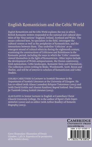 Introduction: Romancing the Celt Gerard Carruthers and Alan Rawes; 2. 'And the Celt Knew the Indian': Sir William Jones, the Celtic Revival and the Oriental Renaissance Michael Franklin; 3. 'Our Names may be Heard in Song. But what avails it when our strength has ceased?': The Critical Response to Ossian's Romantic Bequest Dafydd R. Moore; 4. Blake and Gwendolen: Territory, Periphery and the Proper Name David Punter; 5. The Welsh American Dream: Iolo Morganwg, Robert Southey and the Madoc Legend Caroline Franklin; 6. Wordsworth, North Wales, and the Celtic Landscape J. R. Watson; 7. 'My Mother's Gordons': the force of 'Celtic memories' in Byron's Thought' Bernard Beatty; 8. 'The Revolt of Erin': Ireland and Islam in Shelley's Oriental Poetry Arthur Bradley; 9. Byron and 'The Ariosto of the North' Andrew Nicholson; 10. Scott and the British Tourist Murray G. H. Pittock; 11. Felicia Hemans, Byronic Cosmopolitanism, and the Ancient Welsh Bards William D. Brewer; 12. Writing which Nation? Luttrell of Arran and the Romantic Invention of Ireland Malcolm Kelsall; 13. 'Shining in Modest Glory': Contemporary Northern Irish Poets and Romantic Poetry Michael O'Neill.