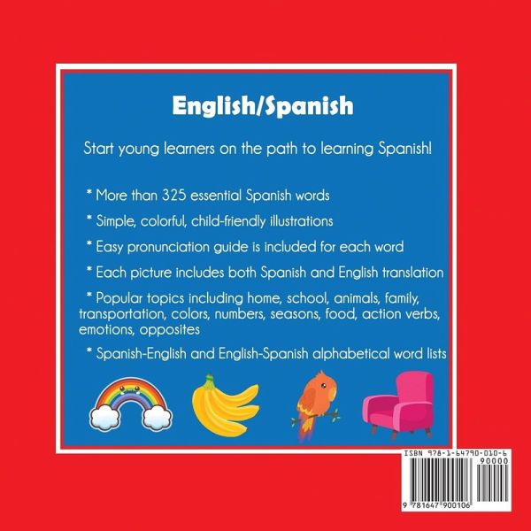 English-Spanish Picture Dictionary Start young learners on the path to learning Spanish! More than 325 essential Spanish words Simple, colorful child-friendly illustrations Simple pronunciation guide is included for each word Each picture included both Spanish and English word Popular topics including home, school, animals, family, transportation, colors, numbers, seasons, food, action verbs, emotions, opposites Spanish-English and English-Spanish alphabetical word lists