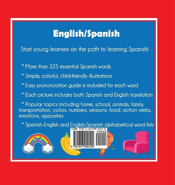 English-Spanish Picture Dictionary Start young learners on the path to learning Spanish! More than 325 essential Spanish words Simple, colorful child-friendly illustrations Simple pronunciation guide is included for each word Each picture included both Spanish and English word Popular topics including home, school, animals, family, transportation, colors, numbers, seasons, food, action verbs, emotions, opposites Spanish-English and English-Spanish alphabetical word lists