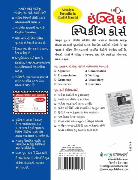 Prastut pustak 'inglish speeking kors' baajaar mein upalabdh angrejee sikhaane vaalee pustakon se alag hatakar vaigyaanik paddhati se likhee gayee hai. is pustak mein angrejee sikhaane kee aadhunik shailee ka prayog kiya gaya hai, jisase paathakon ko angrejee samajhane tatha use dharaapravaah bolane mein aasaanee hogee. Is pustak ko nimnalikhit khandon mein baanta gaya hai-Alphabet ; Pronunciation; Grammar; Sentences; Conversation; Writing; Vocabulary; Exercises Pustak kee visheshataen- Angrejee shabdon ka sahee uchchaaran Shabd rachana evan vaaky rachana Angerajee vyaakaran kee saral prastuti Pratyek paristhiti evan vyakti ke anukool vaaky Hindi evan angrejee mein 50 shreshth vaartaalaap Patra-lekhan evan anuvaad Email evan WhatsApp par vistrt adhyaay Vargeekrt shabdaavalee hindee tatha angrejee mein sammilit Aatm-pareekshan hetu abhyaas uttar sahit(This book 'English Speaking Course' is written in different scientific methods than the English teaching books available in the market. In this book, the modern style of teaching English has been used, allowing readers to understand English and speak fluently. This book is divided into the following sections - alphabet; Pronence; Grammar; Sentences; conversation; writing; Vocabulary; Exercises Book Features-Correct pronunciation of English wordsWord composition and syntaxSimple presentation of English Grammar Every situation and person friendly sentence50 Best Conversation in Hindi & EnglishLetter-writing and translation Detailed chapters on email and whatsappClassified terminology included in Hindi and EnglishWith self-test practice answers) #v&spublishers