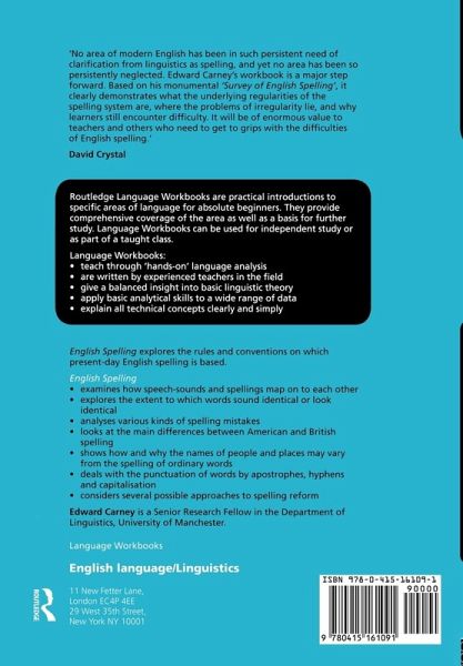 English Spelling explores the rules and conventions on which present-day English spelling is based. This Language Workbook: * Examines how speech-sounds map onto each other * Explores the extent to which words sound identical or look identical * Analyzes various kinds of spelling mistakes * Looks at the main differences between American and British spelling * Shows how and why the names of people and places may vary from expected spelling conventions * Deals with the punctuation of words by apostrophes, hyphens and capitalisation * Considers several possible approaches to spelling reform