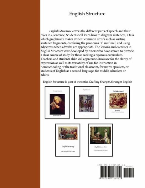This first book in a series, English Structure covers the different parts of speech and their roles in sentences. Students will learn how to diagram sentences, a task which graphically makes evident common errors such as writing sentence fragments, confusing the pronouns "I" and "me", and using adjectives when adverbs are appropriate. Not all students will need this volume. Those who have read widely and well, or who already achieved a good grasp of grammar, may prefer to proceed directly to the next volume, Usage. English Structure is part of the series Crafting Sharper, Stronger English series; English Structure, The English Sentence Up Close, English Abused, and English Mastery. The series teaches the rules of grammar, syntax, and writing in a clear and systematic way. These books also serve as workbooks, with plentiful exercises to help students identify and remedy their weak points. In the short term, the books will help middle school, high school, and even college students perform better on standardized admissions tests, such as the HSPT, SSAT, PSAT, SAT, GMAT, GRE, and LSAT. More importantly, the books prepare a strong foundation for the communication skills that will serve students throughout their lives. An attempt to redress the loss of instruction in the fundamental of English is the series Crafting Sharper, Stronger English.